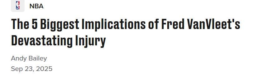北京时间9月23日,知名美媒B/R分析了范弗利特赛季报销带来的连锁反应。他们认为,失去范弗利特后,火箭队在争冠梯队中的位置明显动摇。