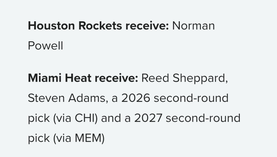火箭送出谢泼德、亚当斯、2026年次轮选秀权(来自公牛)、2027年次轮选秀权(来自灰熊),换取热火的诺曼-鲍威尔