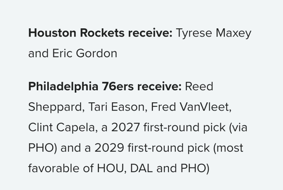 火箭送出谢泼德、伊森、范弗利特、卡佩拉、2027年首轮选秀权(来自太阳)、2029年首轮选秀权(火箭、独行侠、太阳三队中排名最高的一个),换取76人的马克西和埃里克-戈登