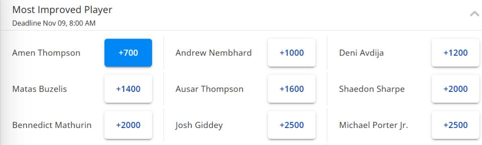 这一奖项赔率的变化也反映了外界对阿门的认可。在范弗利特受伤之前,内姆布哈德、阿弗迪亚等人的赔率都高于阿门,但现在,阿门(+700)已跃升为第一热门,内姆布哈德、阿弗迪亚、布泽利斯和奥萨尔-汤普森依次排在第二至第五位。