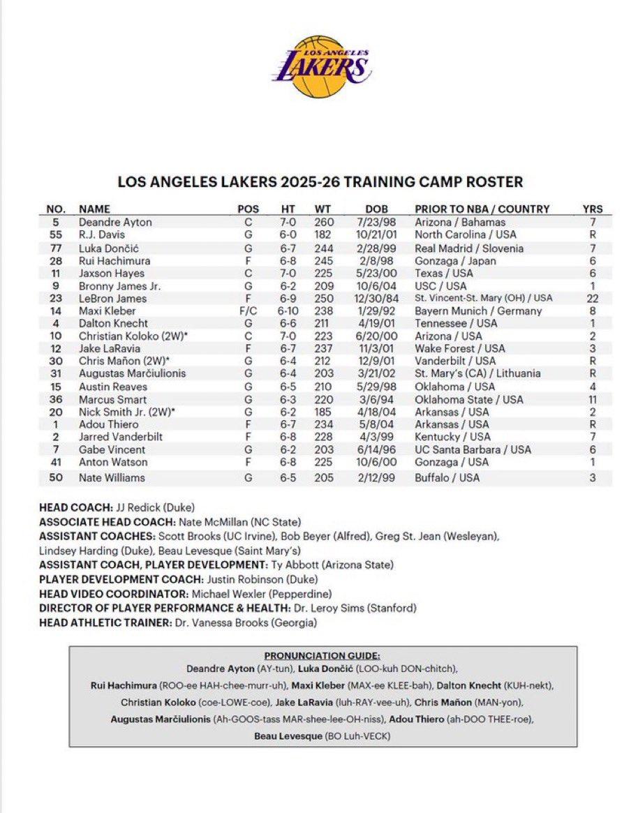 湖人官方公布的训练营21人名单如下:5号艾顿、55号RJ-戴维斯、77号东契奇、28号八村垒、11号海耶斯、9号布朗尼、23号詹姆斯、14号克勒贝尔、4号克内克特、10号科洛科、12号拉拉维亚、30号马农、31号马丘里奥尼斯、15号里夫斯、36号斯马特、20号小尼克-史密斯、1号蒂耶罗、2号范德比尔特、7号文森特、41号沃特森、50号内特-威廉姆斯