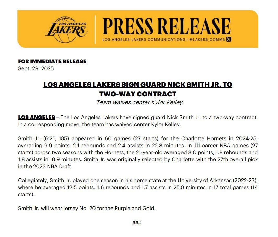 北京时间9月30日,湖人官方确认完成一笔签约和一笔裁员,球队裁掉了中锋凯洛尔-凯利,并与小尼克-史密斯签订了一份双向合同。小史密斯此前被黄蜂队裁掉。随后,湖人公布了训练营21人名单,詹姆斯和东契奇将带队冲击新赛季总冠军。