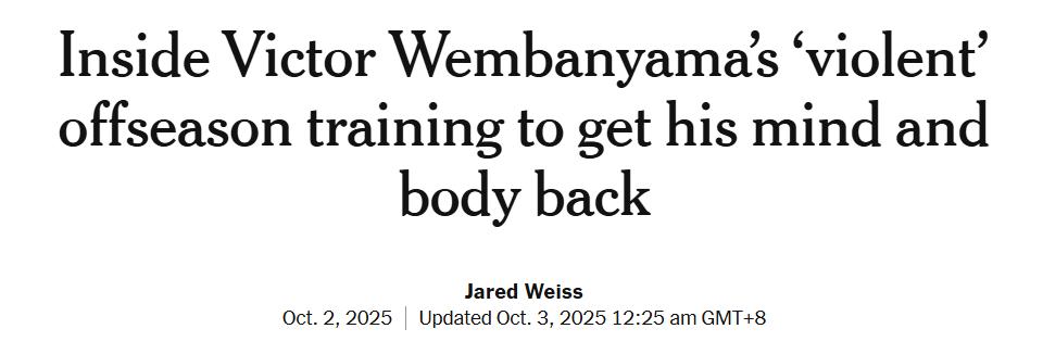 归来后,文班亚马带着坚定的决心投入训练。“今年夏天的训练强度极高,几乎残酷,”他说。而刚才提到的“魔鬼防守训练”,正是其中重要一环。