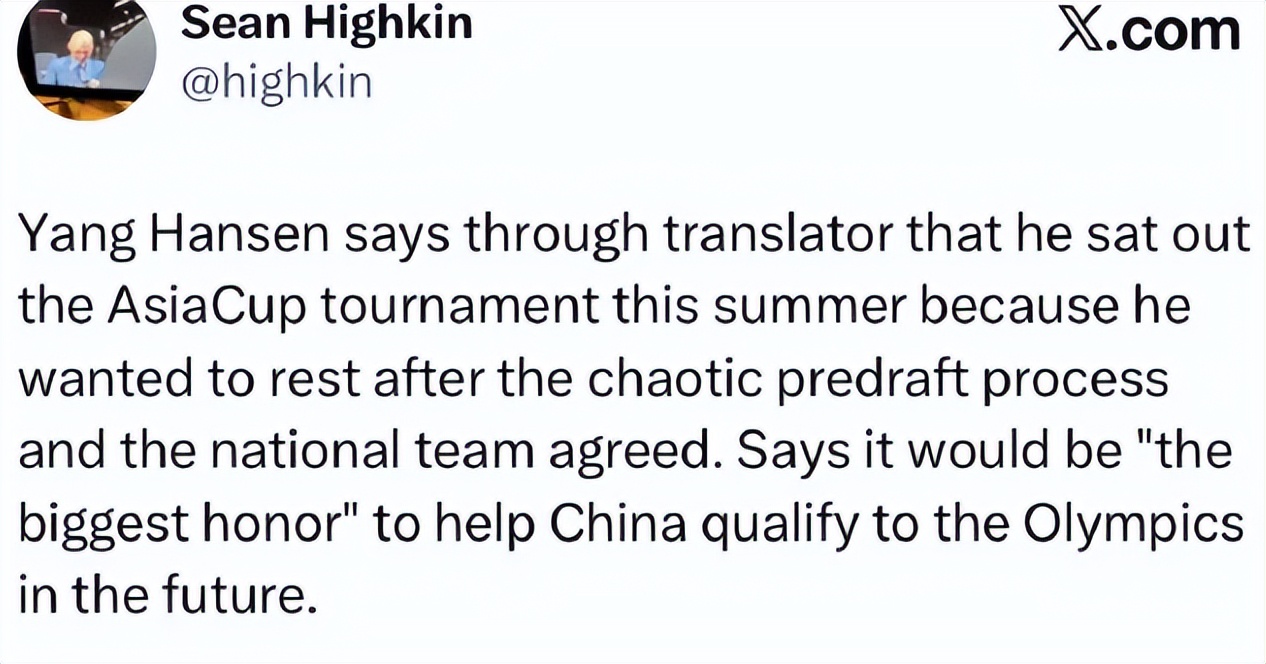 此前,杨瀚森在开拓者新赛季媒体日接受采访时表示:“如果将来能帮助中国男篮重返奥运舞台,那将是他最大的荣耀。”