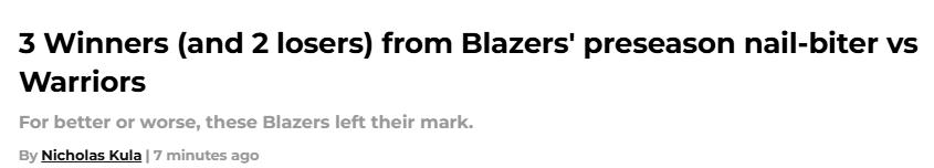 北京时间10月9日,开拓者季前赛首场以123-129败给勇士,经历了21分的逆转。波兰特媒体Rip City Project赛后对比赛进行了评价,公布了队内3个赢家和2个输家。杨瀚森因表现不佳,与格兰特一同被列为输家。以下是拓媒的详细分析——