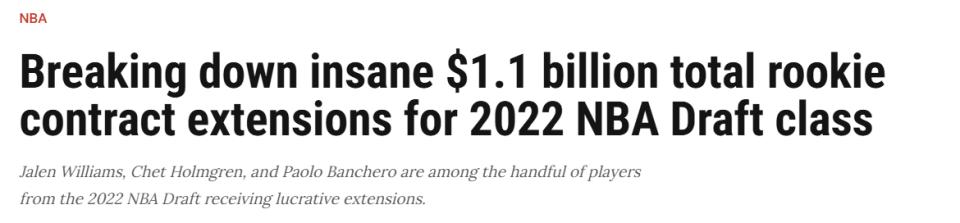 杰伦-威廉姆斯、霍姆格伦和班凯罗等2022届NBA新秀,都拿到了丰厚的续约合同。对NBA球队和新秀合同进入最后一年阶段的球员来说,新赛季开始前的续约谈判一直是与时间的竞赛。今年也不例外,多名2022届首轮知名新秀与球队展开多轮谈判,力争签订长期合同。