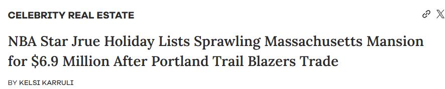 北京时间10月22日,据《纽约邮报》消息,朱·霍勒迪与凯尔特人队的关系迅速解除,没有任何拖泥带水。在被交易到开拓者队仅数月后,他就以690万美元的价格挂牌出售位于马萨诸塞州的豪宅。