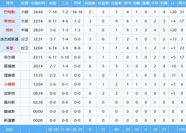 勇士有四人得分达到两位数,巴特勒16罚全中,砍下31分并贡献5篮板4助攻,库里得到23分4助攻,库明加贡献17分9篮板6助攻,希尔德拿下17分。
