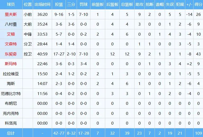 至于湖人方面,东契奇投篮27中17,以约63%的命中率高效砍下43分12篮板9助攻,几乎完成三双,瘦身后的状态明显提升,竞技水平也随之提高;里夫斯16投9中,贡献26分9助攻,几乎达成两双,但遗憾的是出现了5次失误。