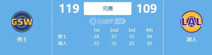 比赛结束时,勇士以119-109击败湖人,赢得新赛季开门红。