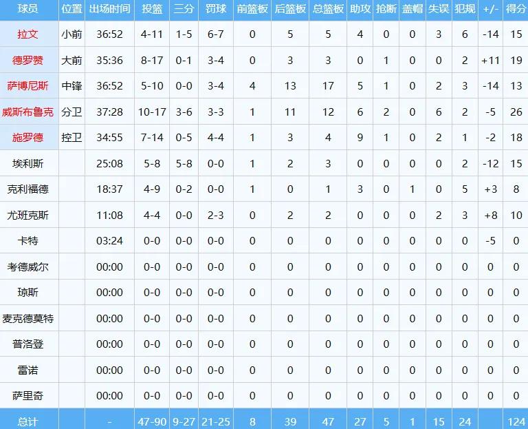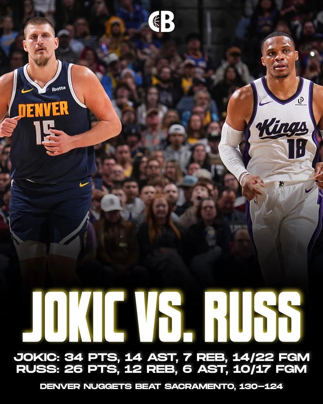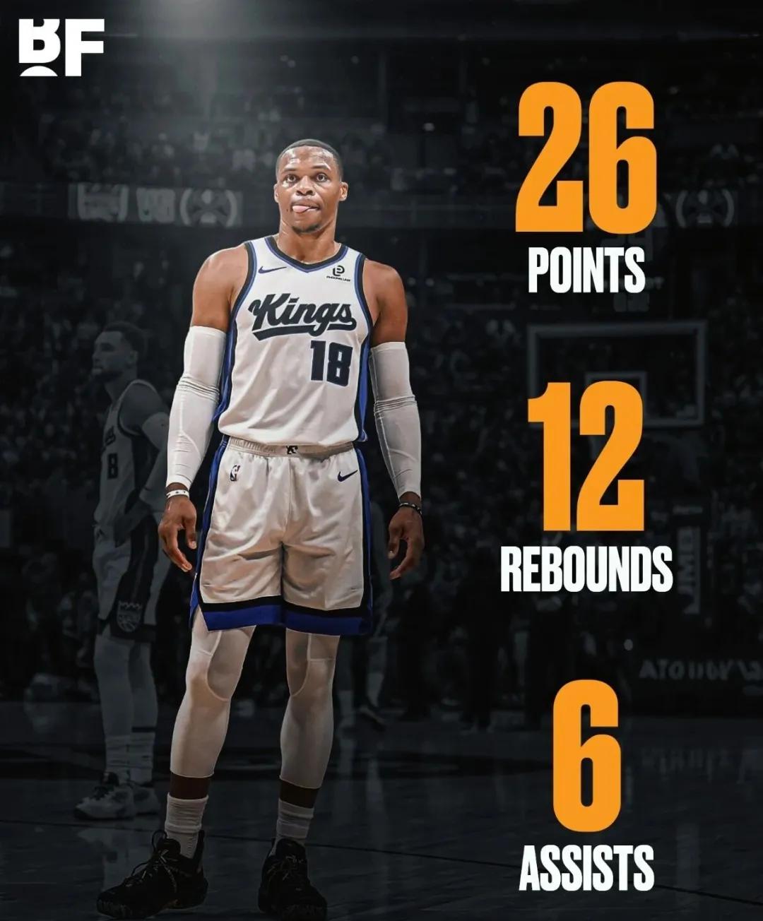 国王以124比130惜败掘金,这场比赛威少担任首发大前锋,面对昔日球队交出本赛季最佳表现,出场约37分钟,投篮17投10中,三分球6投3中,罚球3罚3中,贡献26分12篮板6助攻2抢断的爆炸数据。