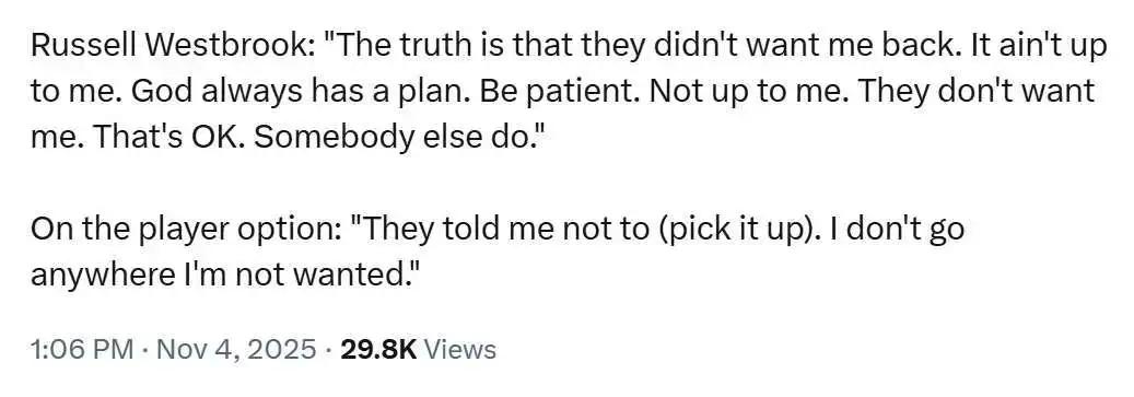 一直有人好奇威少今夏为何拒绝执行价值347万美元的25-26赛季球员选项,离开掘金,选择加盟没有争冠希望且只能拿无保障底薪的国王,这操作确实令人费解。