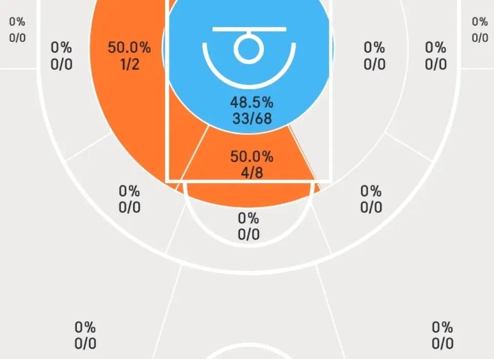 本赛季至今,他大约87%的投篮都集中在内线,几乎没有中远距离得分。
