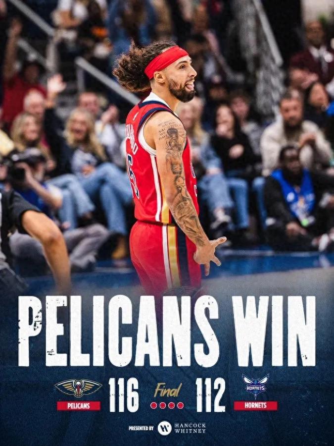 西部垫底球队对阵东部第11名,鹈鹕以116-112战胜黄蜂,取得本赛季首场胜利,当前战绩为1胜6负。