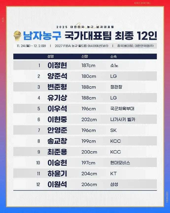 韩国男篮则早早公布了对阵中国男篮的12人大名单,最高身高2米06,由他们的核心球员李贤重领衔。两队将继今年亚洲杯八强赛后再次交手,名单如下: