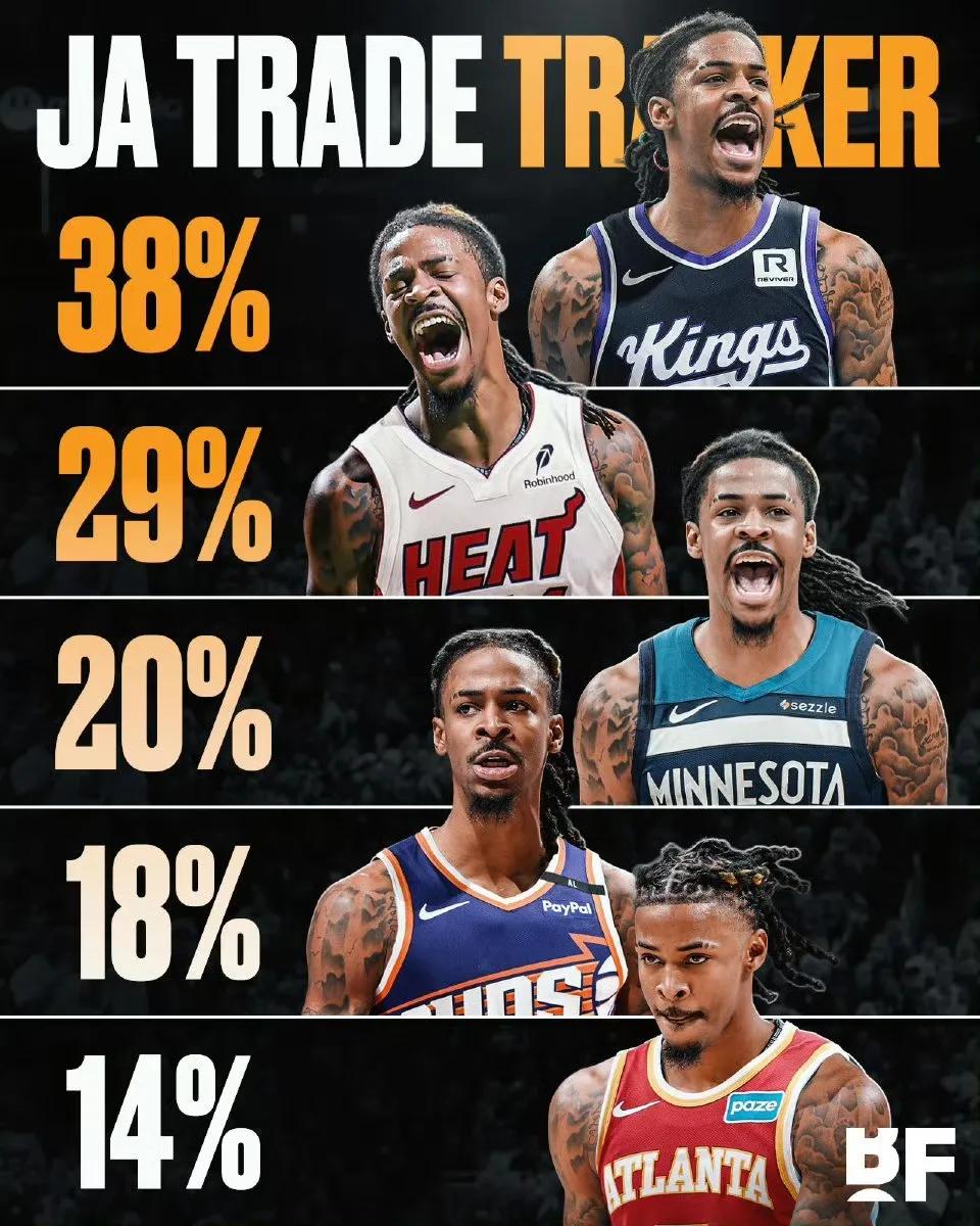 关于莫兰特的交易传闻层出不穷,近日美媒《BF》公布了他潜在新东家的概率,国王以38%领先,热火29%紧随其后,森林狼以20%排第三,太阳18%第四,老鹰14%位列第五。