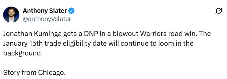 北京时间12月8日,勇士队薪资第四高的库明加,在球队以123-91大胜公牛的比赛中未出现在11人出战名单中,而勇士本场缺少库里、格林和霍福德三位主力。勇士记者Slater报道如下——