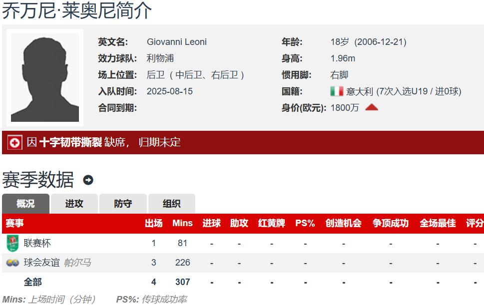 现年18岁的莱奥尼,身高1.96米,惯用右脚,司职中卫,与利物浦的合同签至2031年,德转估值为1800万欧元。莱奥尼在利物浦首秀中即遭遇十字韧带撕裂的重伤,实在是非常不幸。此伤对高个子中卫来说极具威胁。希望莱奥尼能好好休养,恢复后逐步复出,年轻的身体恢复速度快,期待他明年强势回归。