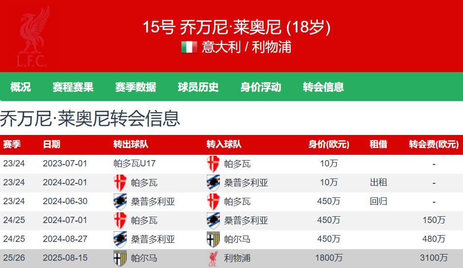 莱奥尼去年夏天以480万欧元的转会费从桑普多利亚加盟帕尔马,仅一个赛季后,他又以3100万欧元的身价从桑普多利亚转会至利物浦,桑普多利亚一年间赚取了2620万欧元,实属大赚一笔。考虑到意甲和英超比赛的强度,小将还是不宜过早加盟英超豪门,首先难以获得稳定出场机会,其次缺乏系统比赛经验,突然参加杯赛极易受伤。