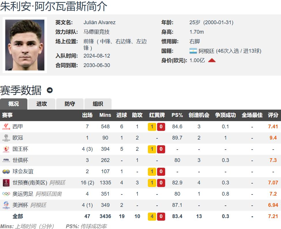 现年25岁的阿尔瓦雷斯身价已高达1亿欧元,凭借目前的年龄和状态,下一次德转更新时他的身价还将继续上涨。去年夏天,曼城以7500万欧卖出阿尔瓦雷斯,马竞可谓捡了个宝,上赛季57场比赛打进29球并助攻8次。这可以看作是他的初露锋芒。