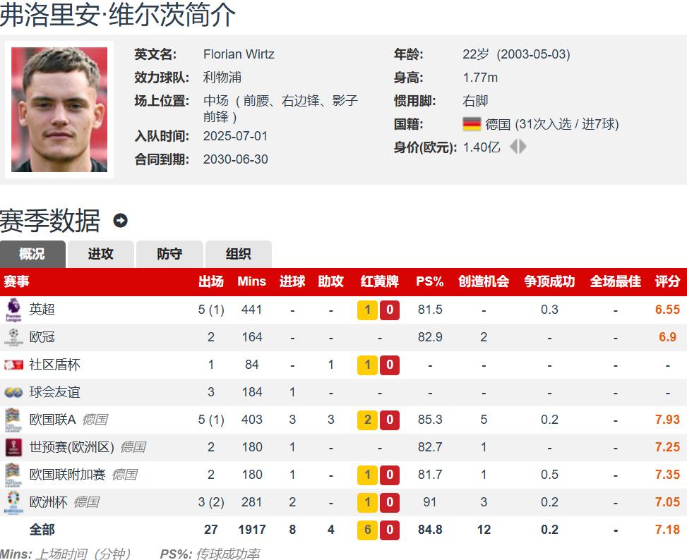 现年22岁的维尔茨加盟利物浦后,在各项赛事中出场9次,英超6场无进球无助攻,欧冠2场同样无进球无助攻,仅在社区盾杯贡献过一次助攻,累计出场时间689分钟,0球1助,这样的数据对于一名进攻型中场和1.25亿欧元的重磅签约来说,显得尤为不符预期。