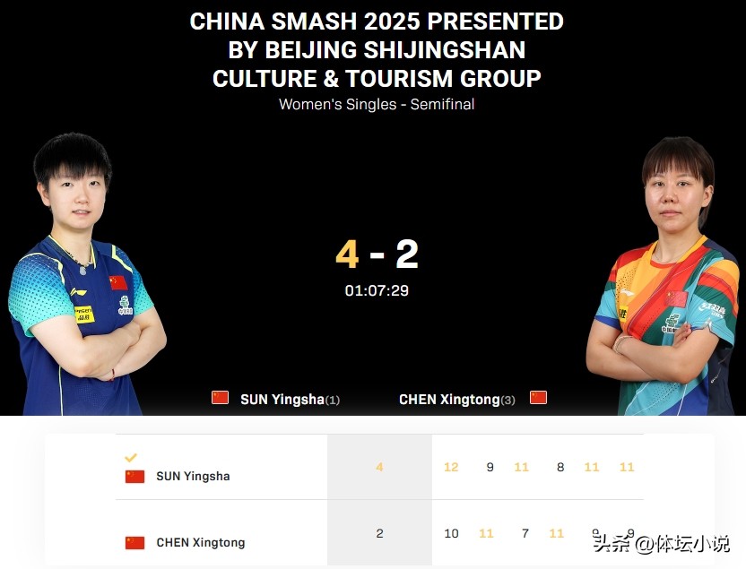 北京时间10月4日,WTT中国大满贯女单半决赛如火如荼地进行中,刚刚结束的一场焦点战中,国乒主力孙颖莎和陈幸同展开激烈对决。经过六局鏖战,孙颖莎以4-2技压陈幸同,成功挺进决赛,展现了强大的实力。六局比分为12-10,9-11,11-7,8-11,11-9和11-9,比赛过程极其激烈!