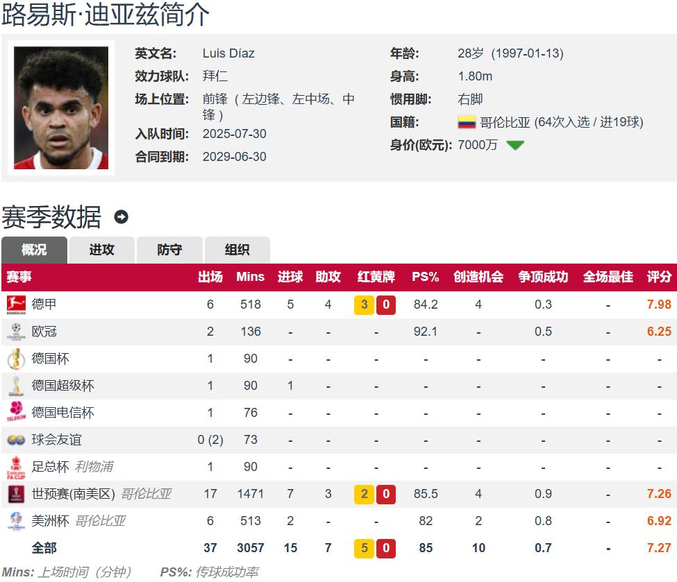 迪亚斯从英超转战德甲,前六轮全部首发,打进5球并贡献4次助攻,场均参与进球达1.5个,效率极高。他的价值不仅体现在进球数据,更在于拼搏不息的比赛风格,攻守兼备,充满斗志和激情,能够激励全队,这正是利物浦目前最为缺乏的品质。