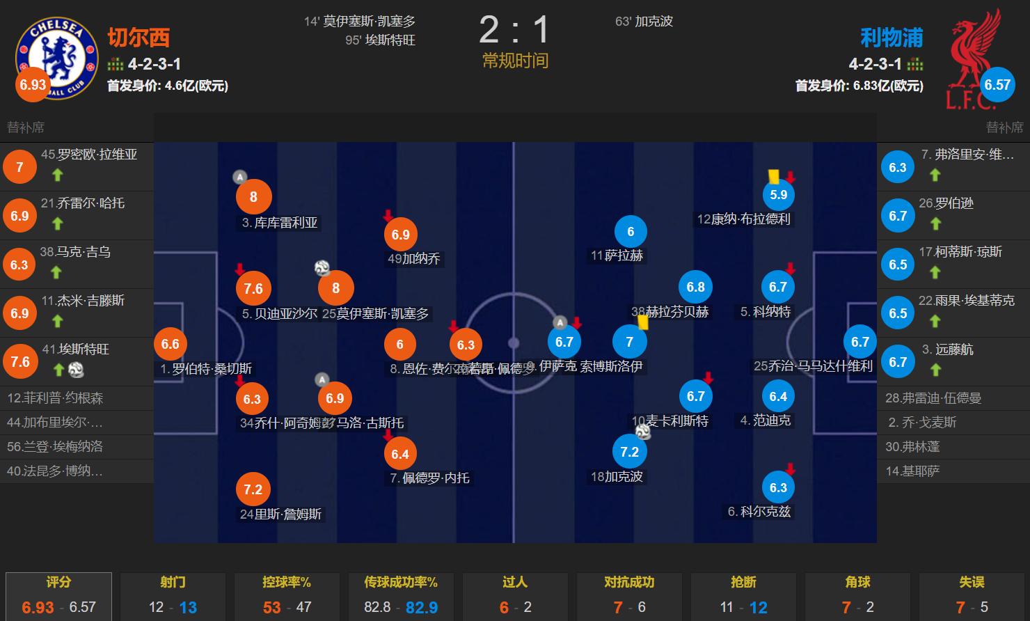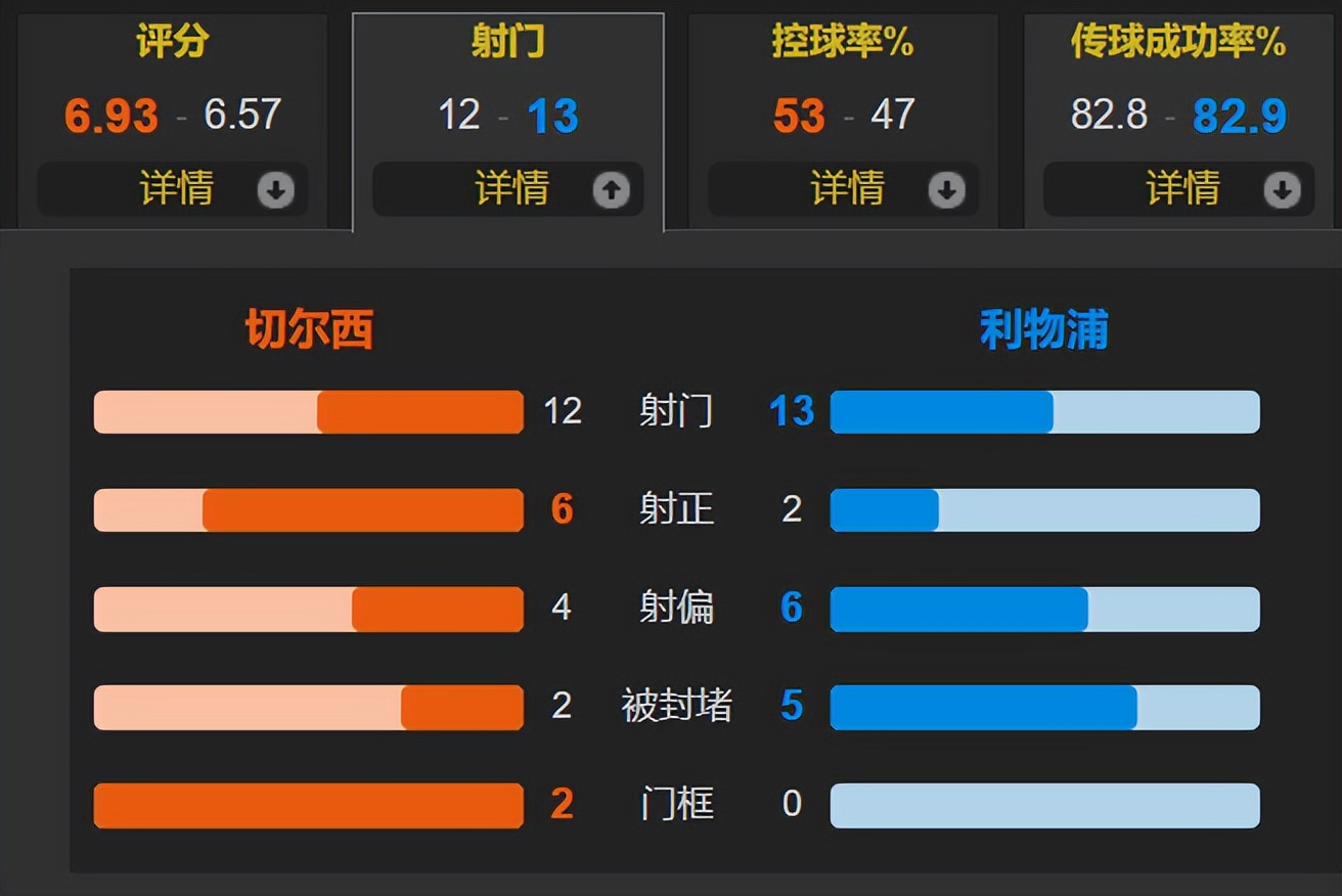 整场比赛中,切尔西控球率为53%,共射门12次,其中6次射正;利物浦射门13次,但仅有2次射正。