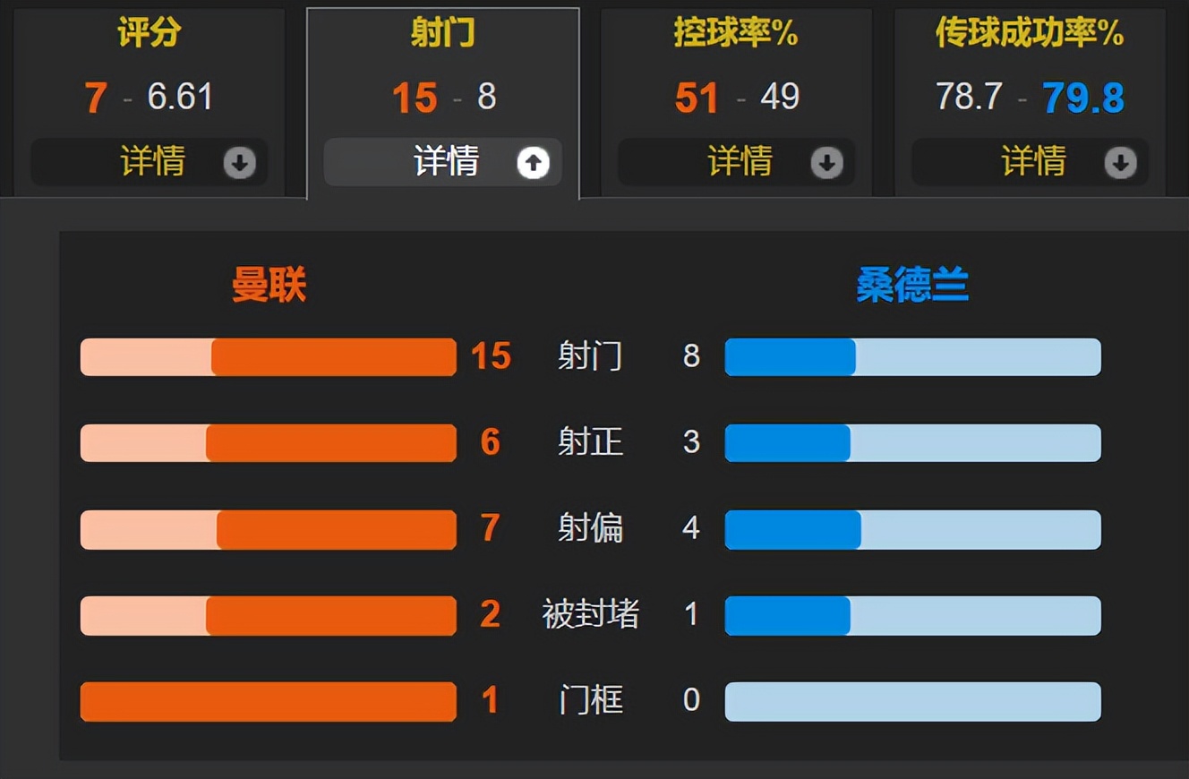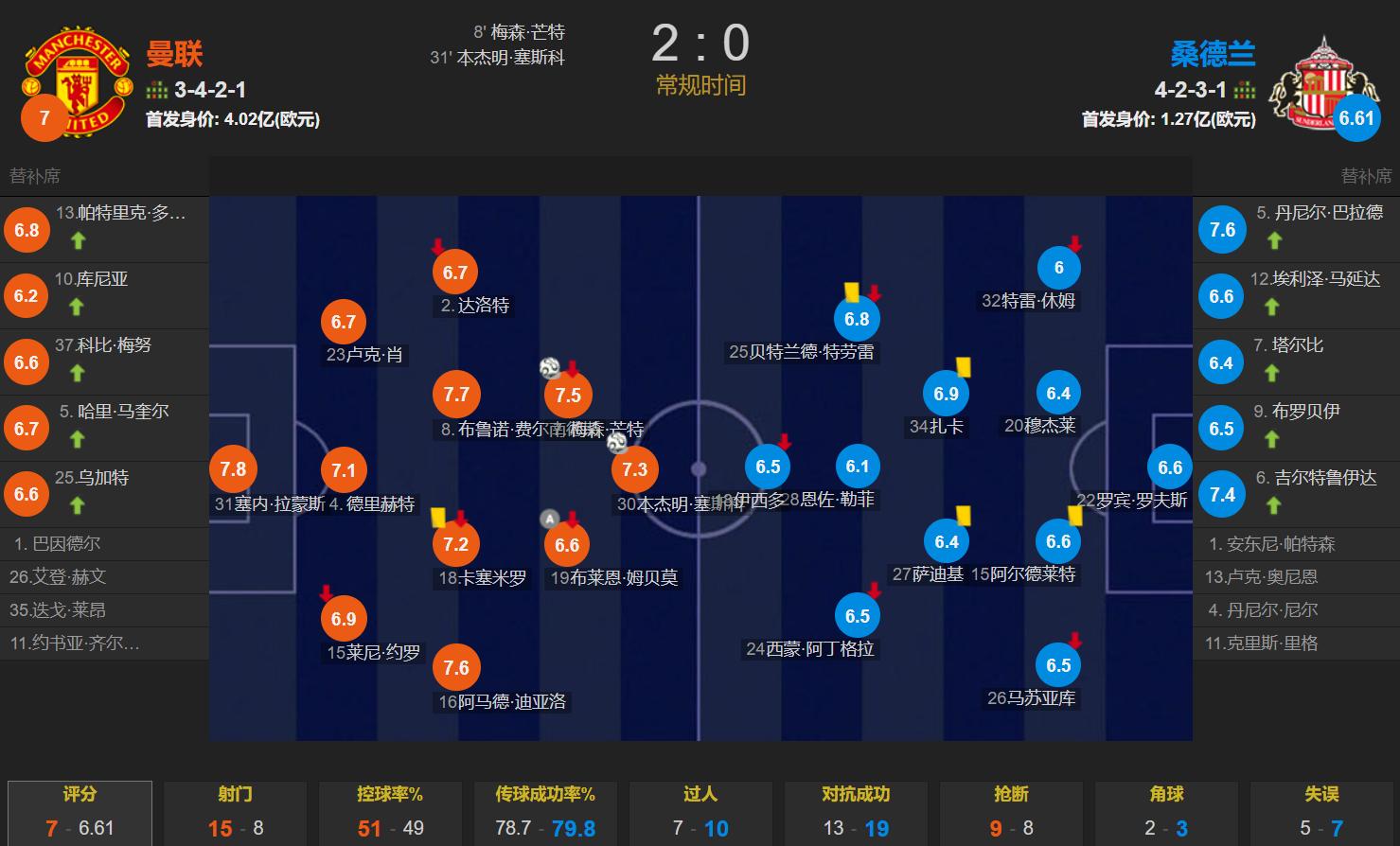 整场比赛,曼联控球率为51%,共射门15次,其中6次射正;桑德兰射门8次,射正3次。。