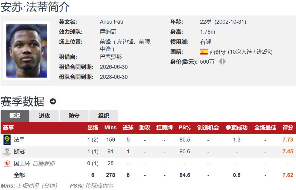 对此,德转制作了一张数据对比图,展示了法蒂过去两年(巴萨+布莱顿)以及本赛季在摩纳哥的表现数据。