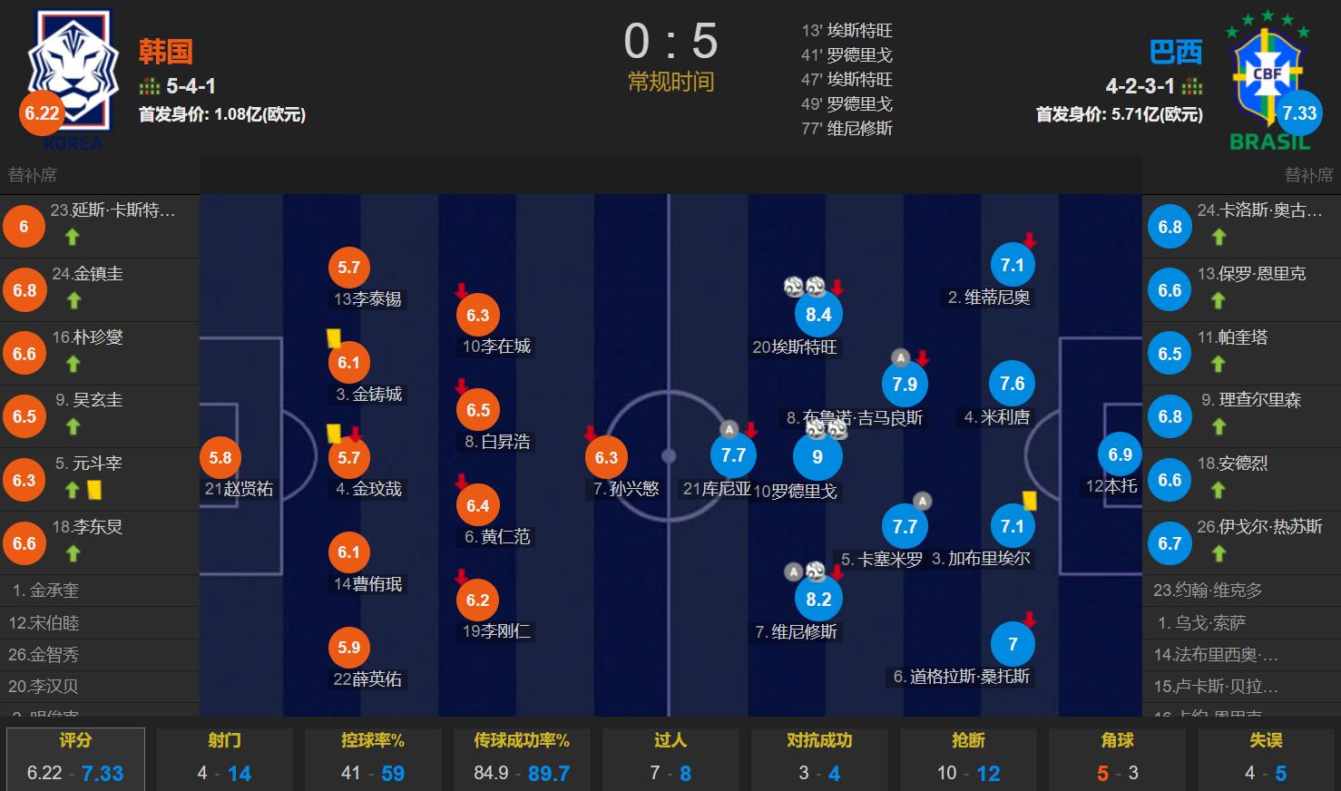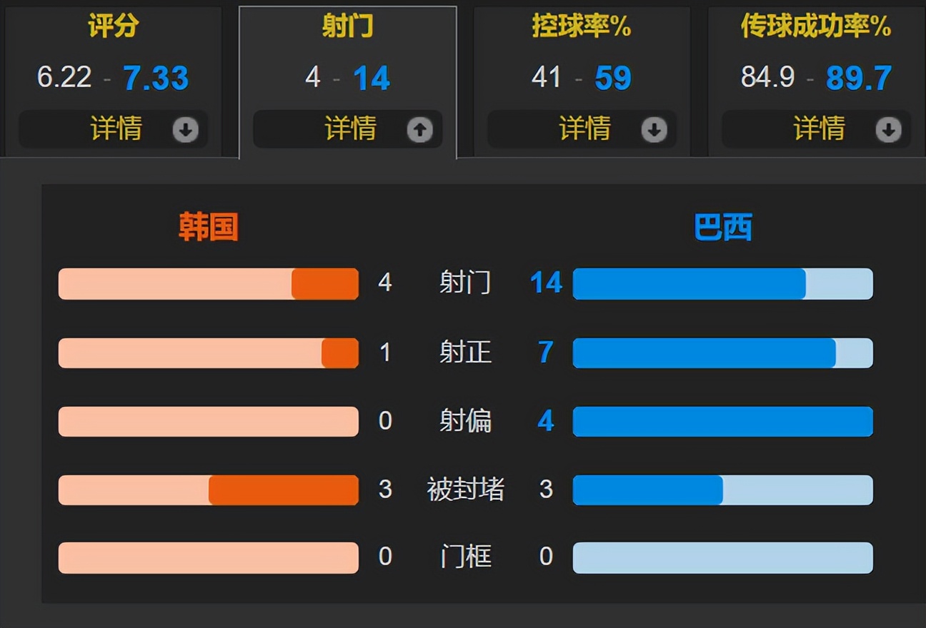 整场比赛,巴西控球率达到59%,共14次射门,其中7次命中目标;韩国则有4次射门,射正仅1次。