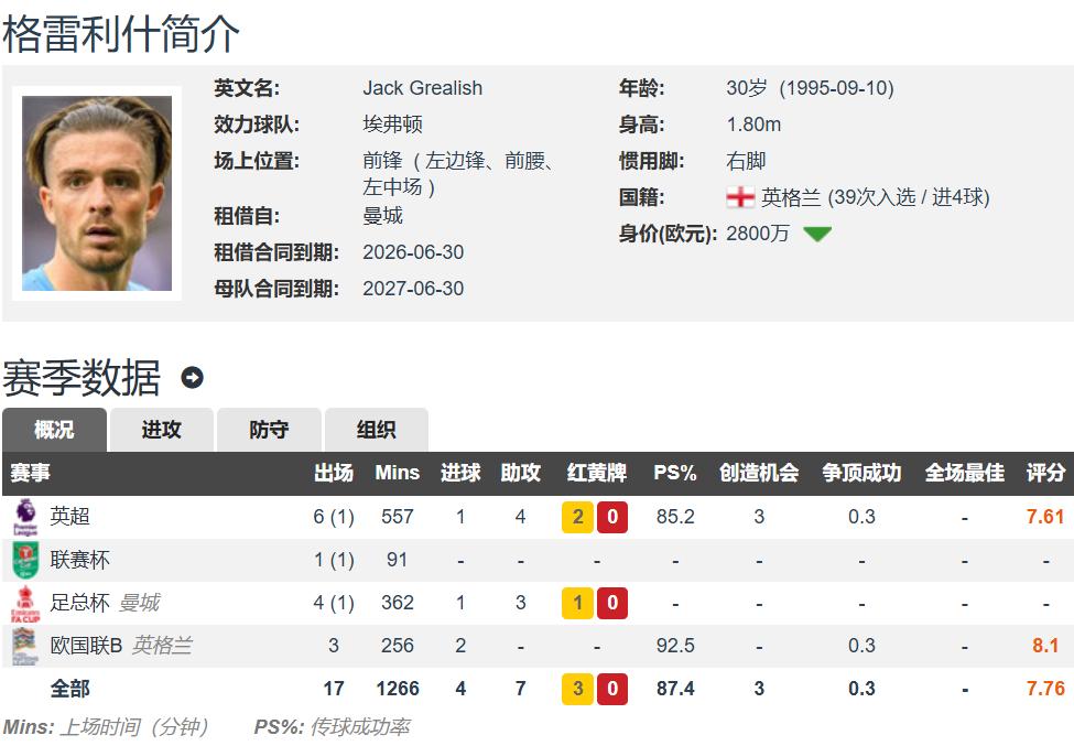 已经30岁的格拉利什本赛季租借加盟埃弗顿,出场了全部7场英超比赛,其中6次首发,贡献了1球4次助攻,直接参与了5个进球,效率非常高。