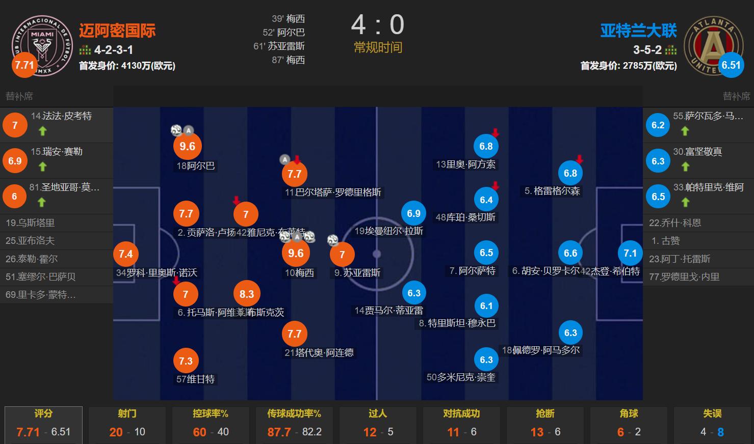 最终,迈阿密国际主场以4-0大胜亚特兰大联,距离积分榜首位差距缩小至4分。