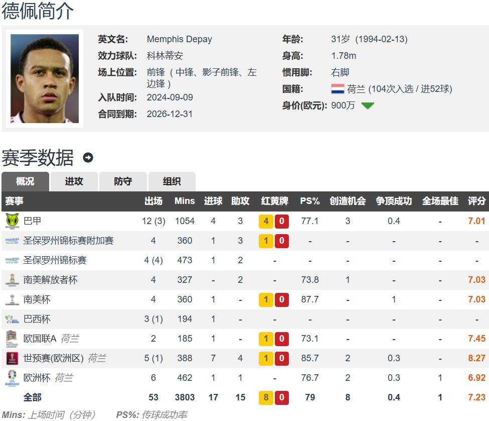 现年32岁的德佩,于去年夏季转会窗以自由身加盟巴甲强队科林蒂安。在本届世预赛中,他参加了荷兰队所有6场比赛,其中5场首发,总计出场388分钟,攻入7球并送出4次助攻。荷兰队6场比赛共打进22球,德佩个人直接参与了其中一半(11球)。他还是荷兰国家队历史上的最佳射手和助攻王,迄今为止已代表国家队出场106次,贡献54球和36次助攻。