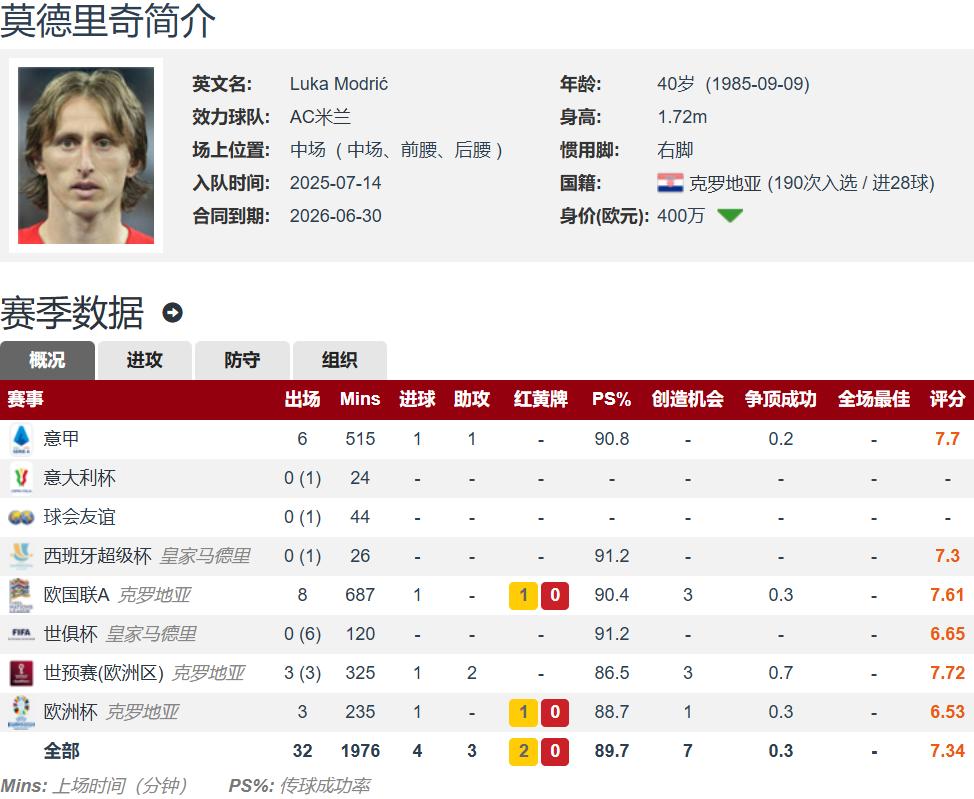 莫德里奇本赛季免签加盟AC米兰,成为球队的绝对主力,意甲前6轮全部首发,贡献1球1助攻。在本届世预赛中,莫德里奇出战全部6场比赛,其中3次首发,贡献1球2助攻。他将在AC米兰继续保持状态,以最佳状态迎接2026年美加墨世界杯,这将是魔笛与梅西一样的世界杯最后一舞。