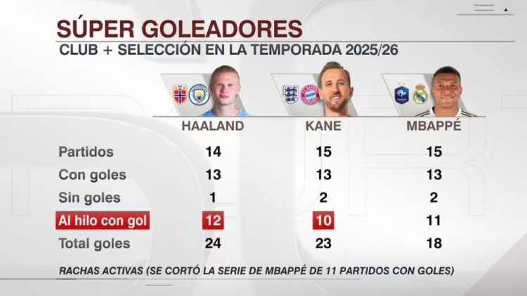 哈兰德在挪威国家队的两场世界杯预选赛中攻入8球,他还为了保持体能缺席了一场国家队友谊赛,可见他并非只顾刷数据;如果单看俱乐部表现,凯恩无疑是效率最高的球员。预计这三大前锋将角逐2026年欧洲金靴奖,虽然德甲比英超和西甲少4轮比赛,但凯恩的惊人效率依然使他成为明年欧洲金靴的最有力竞争者。
