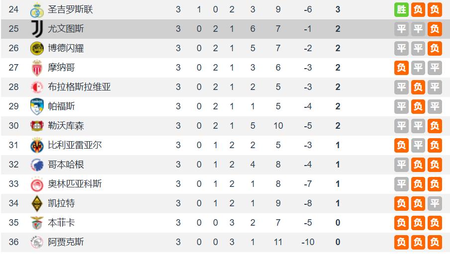 尤文图斯本赛季欧冠表现更为糟糕,三轮比赛取得2平1负,仅积2分,排名第25名,处于淘汰区。欧冠扩军后,联赛阶段共8场比赛,排名前八的球队直接晋级,排名第9至24位的球队进行两回合附加赛以决出另外8个1/8决赛名额;而排名第25至36位的球队则直接被淘汰,不再降级至欧联杯。