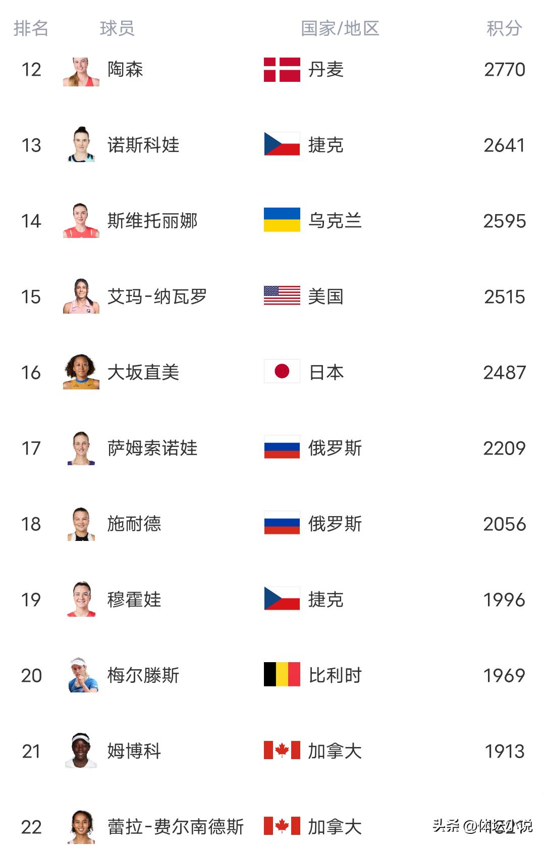 其他选手方面,随着郑钦文排名下滑,亚洲第一易主,大坂直美升至第16位成为亚洲一姐。萨巴伦卡凭借美网冠军和多次赛季冠军,稳居世界第一。斯瓦泰克作为红土名将,排名第二;美国选手高芙凭借法网冠军位列第三;本赛季两次夺得1000赛冠军的美国新星阿尼西莫娃排名第四;佩古拉位列第五。前五名中,美国选手占据三席。