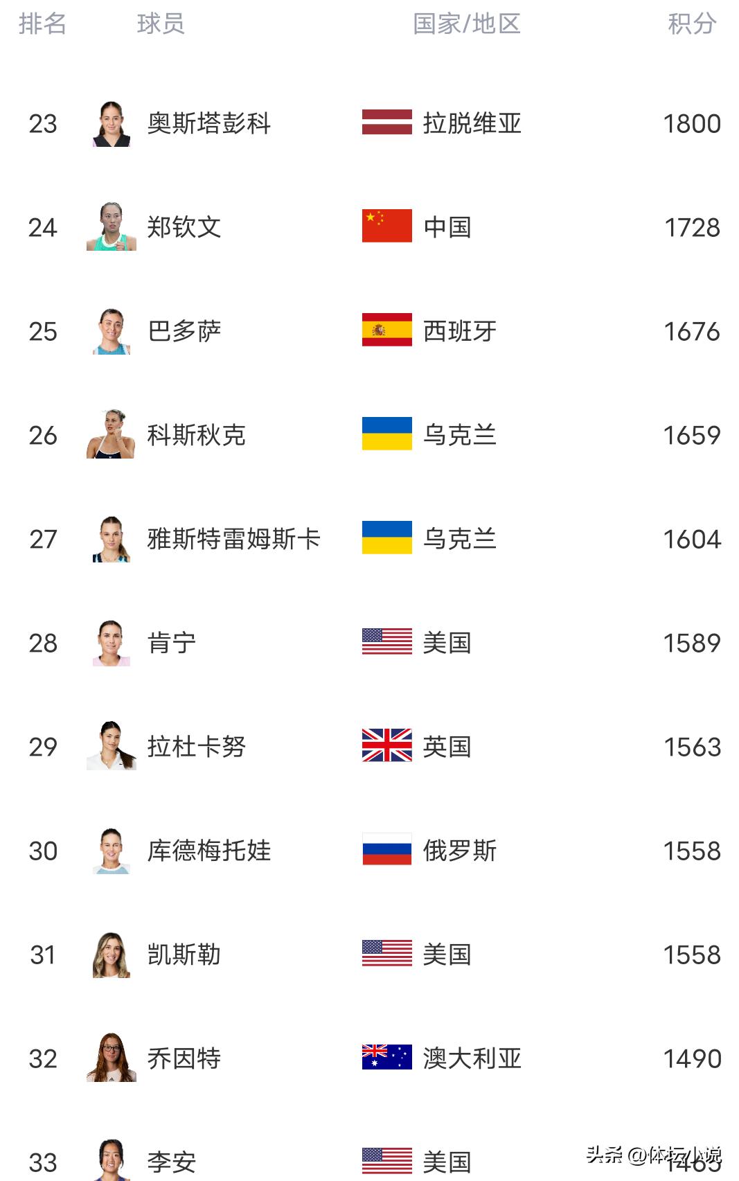 由于缺席多场比赛,郑钦文积分大幅流失,扣除了东京冠军和年终总决赛亚军的积分,排名骤降13位,跌至第24名。实际上,这更贴近她的真实实力,因为她尚未获得过1000级别赛事冠军,更别提大满贯。目前她的弱点明显,发球不稳定,相持阶段也处于劣势,面对萨巴伦卡、斯瓦泰克和高芙等强敌难以取胜。不过,她仍是中国女选手中排名最高的。