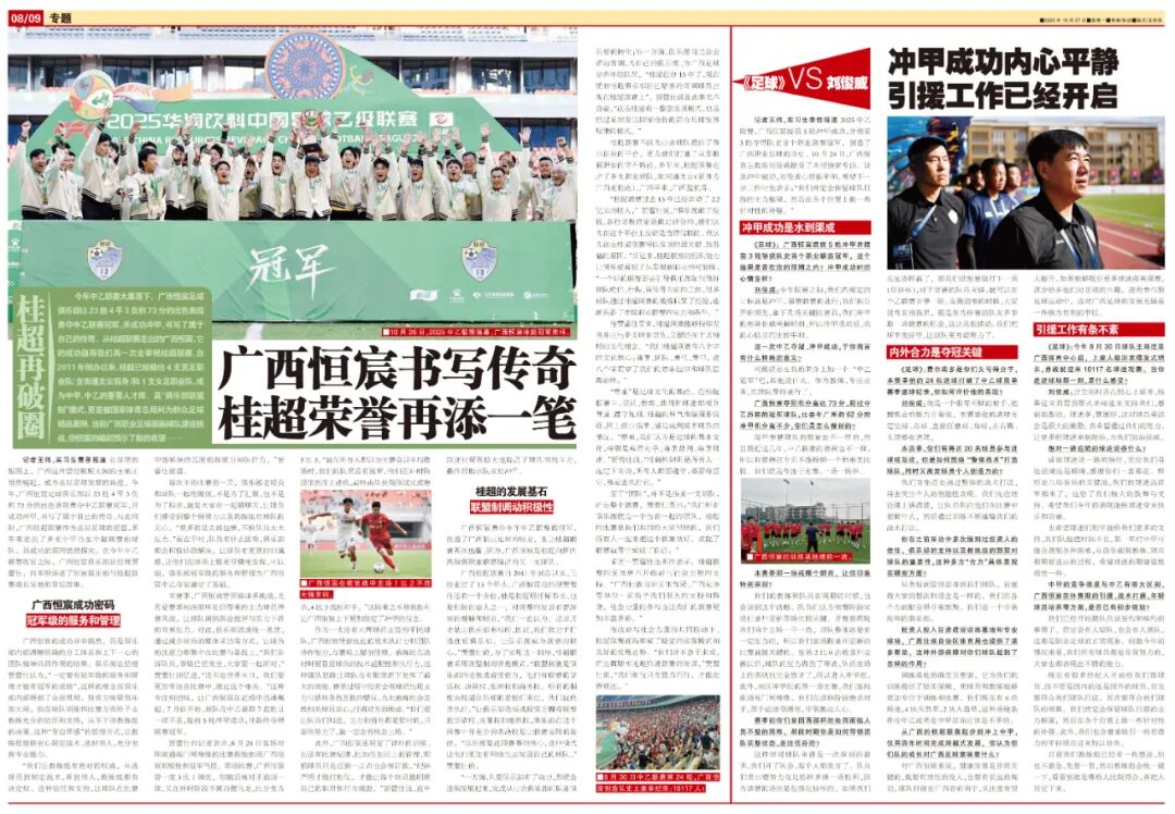 记者王伟、实习生李信报道 2025年中乙联赛中,广西恒宸提前5轮锁定冲甲资格,并提前3轮赢得队史首个职业联赛冠军,创造了广西职业足球的里程碑。10月24日,广西恒宸主教练刘俊威接受了本报独家采访。谈到冲甲成功,刘俊威心态十分平稳。展望未来工作,他表示:“我们会保持球队现有的主力阵容基础,同时在各个位置上进行有针对性的补充。”