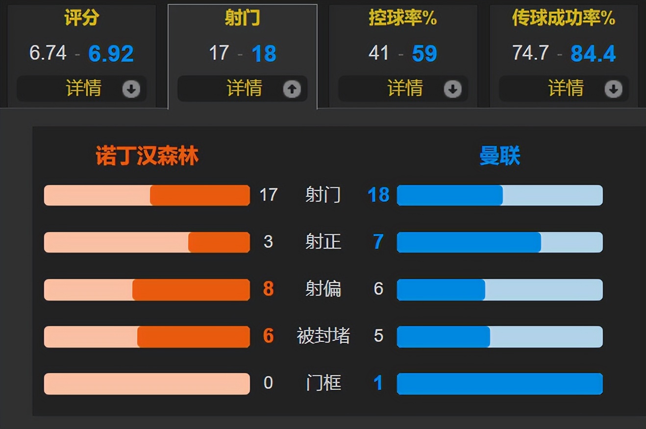 整场比赛中,曼联控球率为59%,共射门18次,其中7次射正;诺丁汉森林射门17次,射正3次。