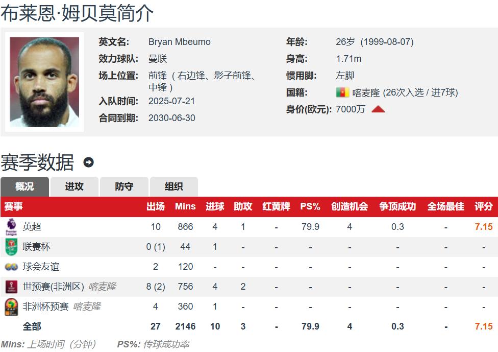 姆伯莫本赛季10场英超出场打进4球并有1次助攻,其中大部分进球和助攻都集中在10月份,占总数的80%。随着他逐渐融入球队,曼联的整体实力将持续增强。姆伯莫加盟后,身价已升至7000万欧元。