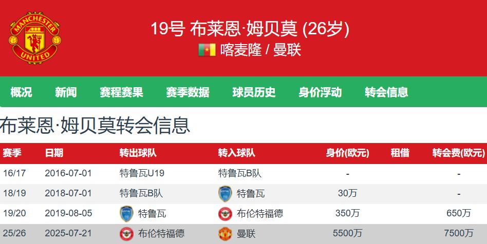 曼联今年夏天花费7500万欧元从布伦特福德引进了这位26岁的喀麦隆前锋,身价5500万欧元。不得不说,顶级球员果然不同凡响,在英超赛场上已经证明了自己的价值,买他绝对不会吃亏。