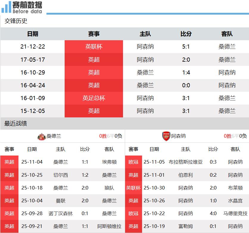 双方近6次交锋,桑德兰取得5胜1平,保持不败。
