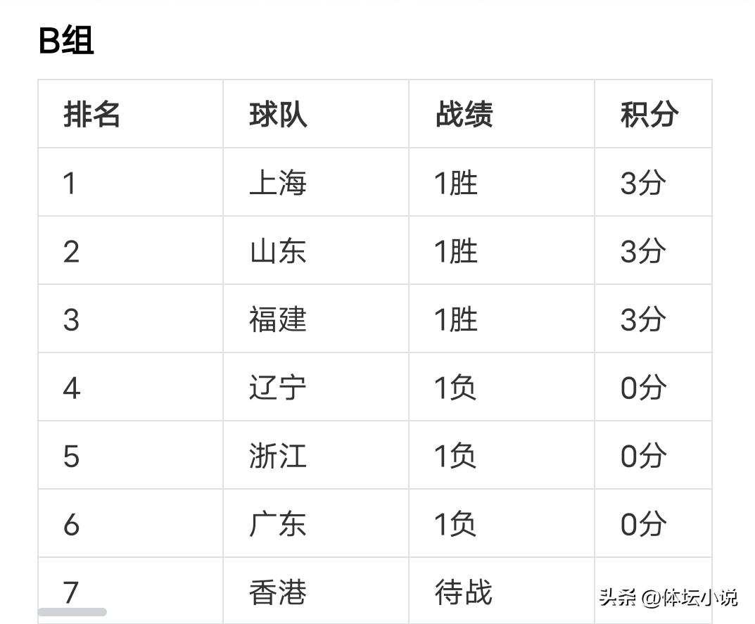 B组三场比赛中,广东对阵强敌上海,场面上毫无优势,被上海全面压制,比赛迅速失控,最终广东0-3惨败,三局均未超过15分,败得十分惨烈。福建对阵辽宁,首局关键球失误以0-1落后,但第二局奋力追回扳平比分,随后福建掌控节奏,在攻防两端压制对手,连赢两局以3-1完成逆转。山东迎战浙江,首局经过激烈争夺才拿下,之后山东气势如虹,逐渐扩大优势,最终以3-0稳稳拿下比赛。