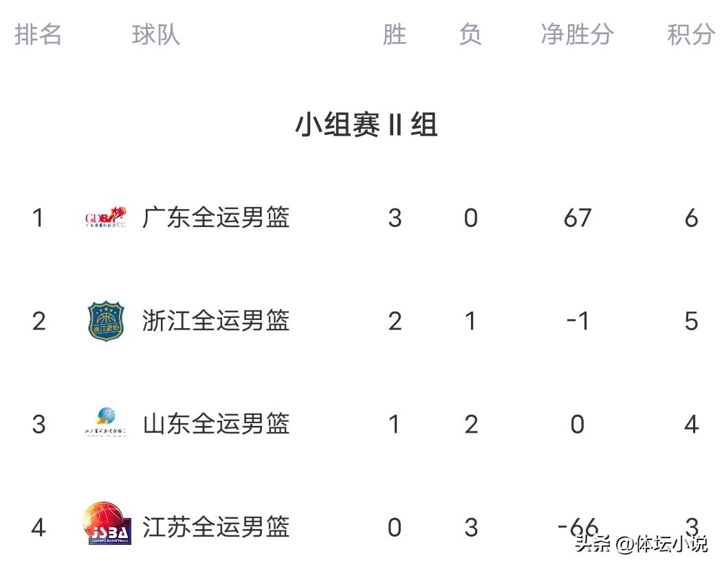 第二小组的两场比赛中,浙江与广东争夺榜首,比赛呈现一边倒局势。浙江状态不佳,场上被广东全面压制,前三节广东迅速拉开比分,基本提前锁定胜局。末节广东攻势有所减弱,浙江也未能反击,最终广东击败浙江,取得三连胜并锁定小组第一。山东对阵江苏,前三节山东强势出击,江苏节节败退,分差不断扩大。末节江苏虽奋力反扑追分,但因落后过多无力回天,最终山东轻松获胜,锁定八强席位!