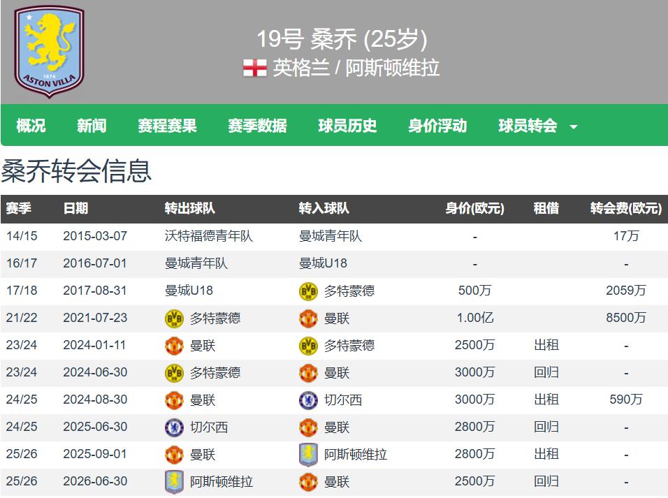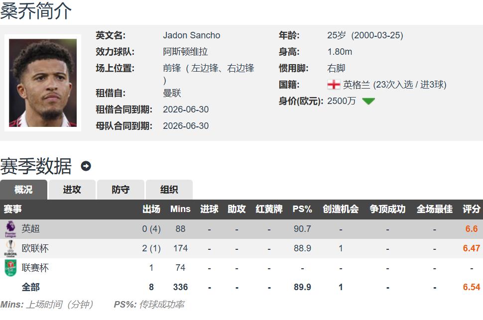 根据意大利转会专家罗马诺的最新消息,桑乔目前被租借到阿斯顿维拉,英超仅作为替补出场4次,总共88分钟,未有进球和助攻,买断可能性很低。桑乔与曼联的合同将在本赛季结束时到期。今年夏天,曼联极力推销桑乔,但没有球队愿意永久签下,只有英超、意甲和土超的球队提出租借报价,最终桑乔租借加盟阿斯顿维拉,但未能获得埃梅里的重用,表现不及上赛季拉什福德租借至维拉时。考虑到桑乔每周20万英镑的高薪,曼联不愿激活续约一年的合同选项,这意味着他将在本赛季结束后合同到期,明年夏天将自由转会。
