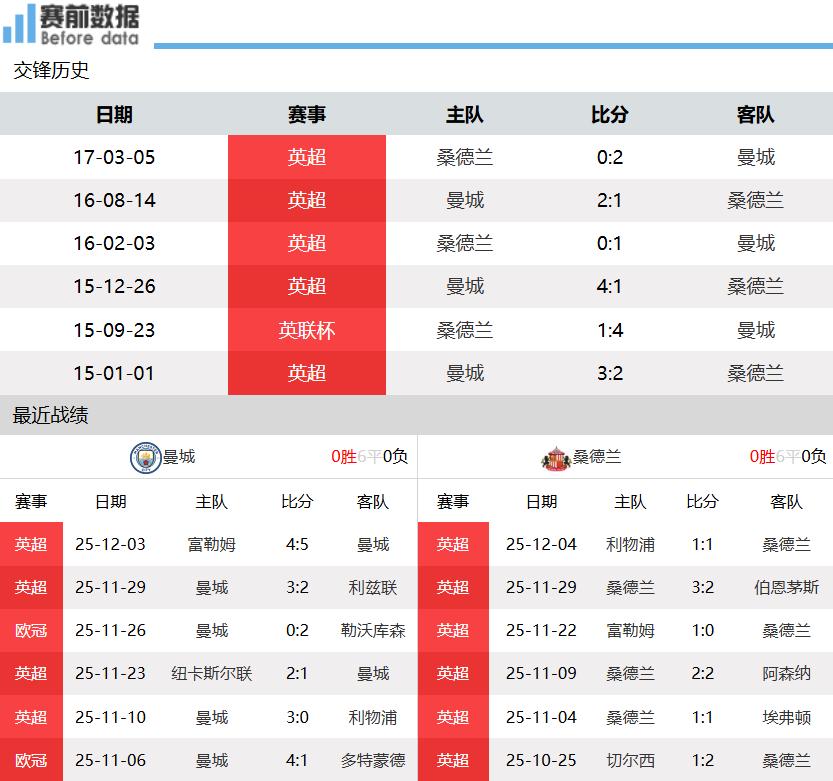 北京时间12月6日晚上23时,英超第15轮,曼城主场迎战桑德兰,央视CCTV5+将会直播本场比赛。