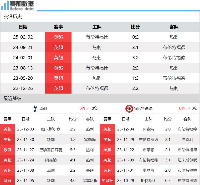 北京时间12月6日晚上23点,英超第15轮,热刺将在主场对阵布伦特福德。
