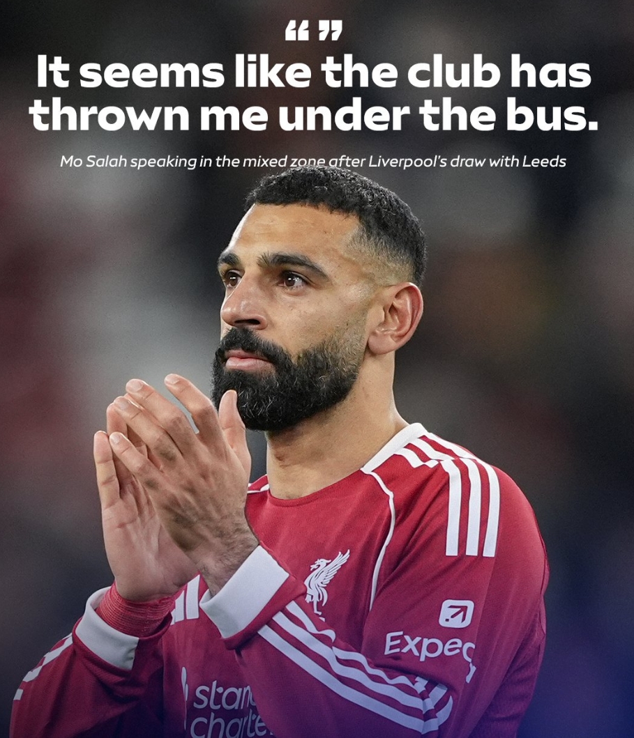 被主帅斯洛特排除在首发之外的球队功勋及高薪球员萨拉赫在赛后混采区接受采访时,直言不讳地批评俱乐部,他这样说:“我真的难以置信,也感到非常失望。我为利物浦付出了很多,可教练组却让我坐冷板凳,我根本不明白原因是什么。我感觉俱乐部和教练组已经放弃了我。坦白说,我无法接受自己在利物浦的处境。感觉自己被当成球队引援失误和糟糕成绩的替罪羊,但我不认为球队的低迷是我的错。这会是我在利物浦的最后一场比赛吗?一切皆有可能。”。